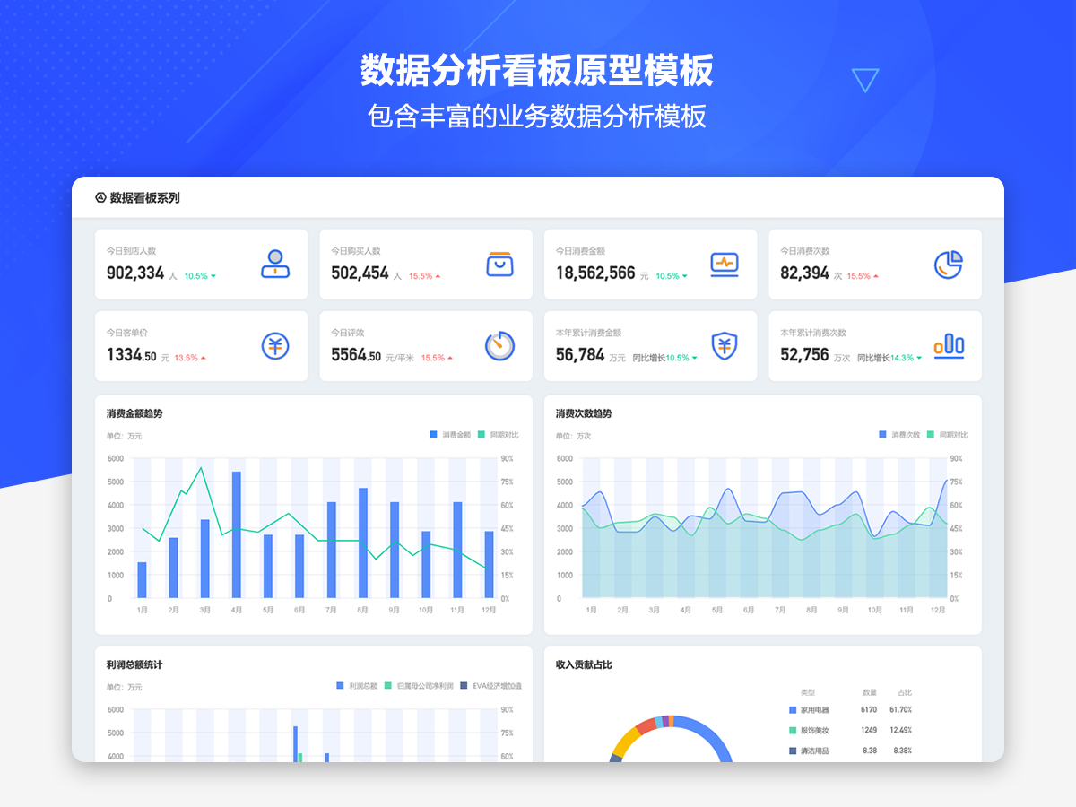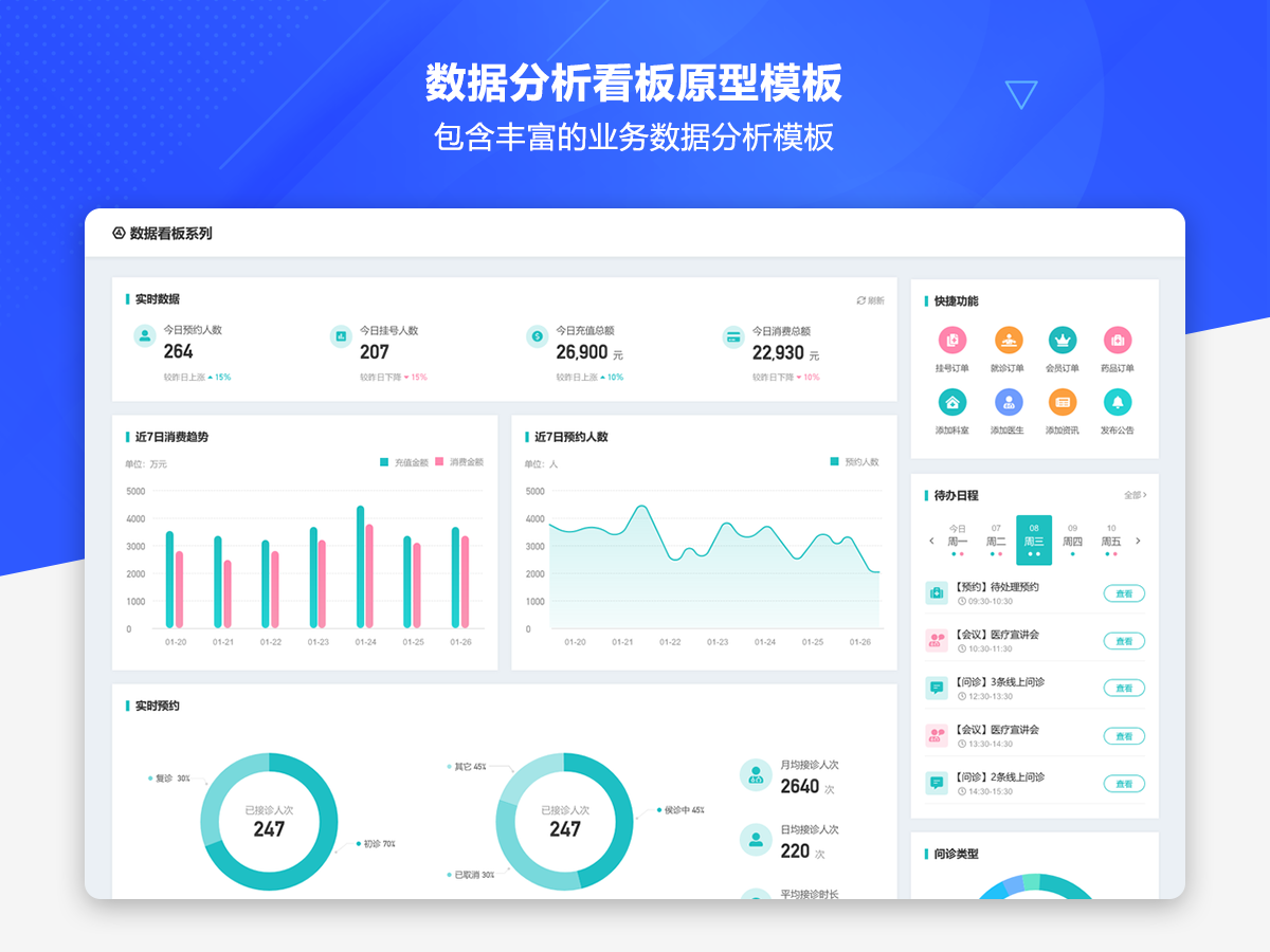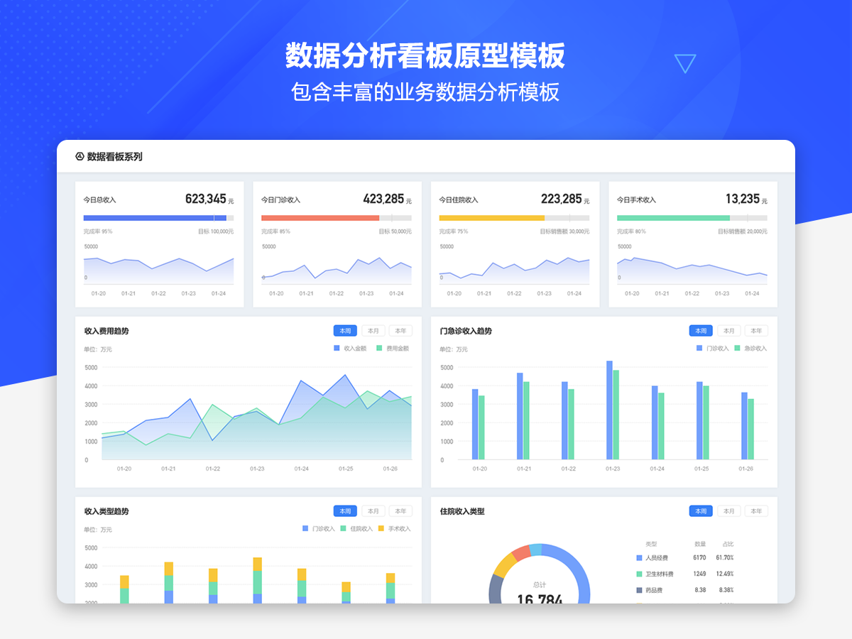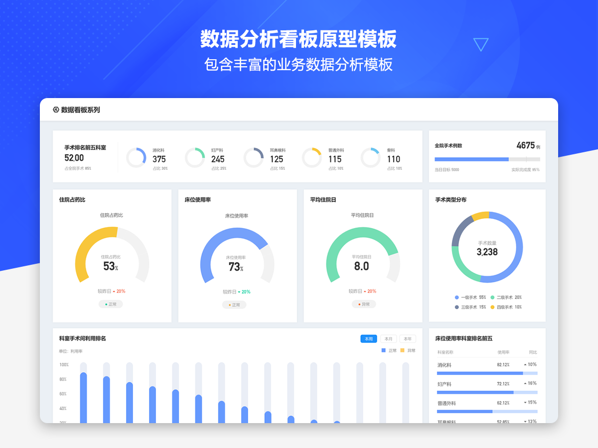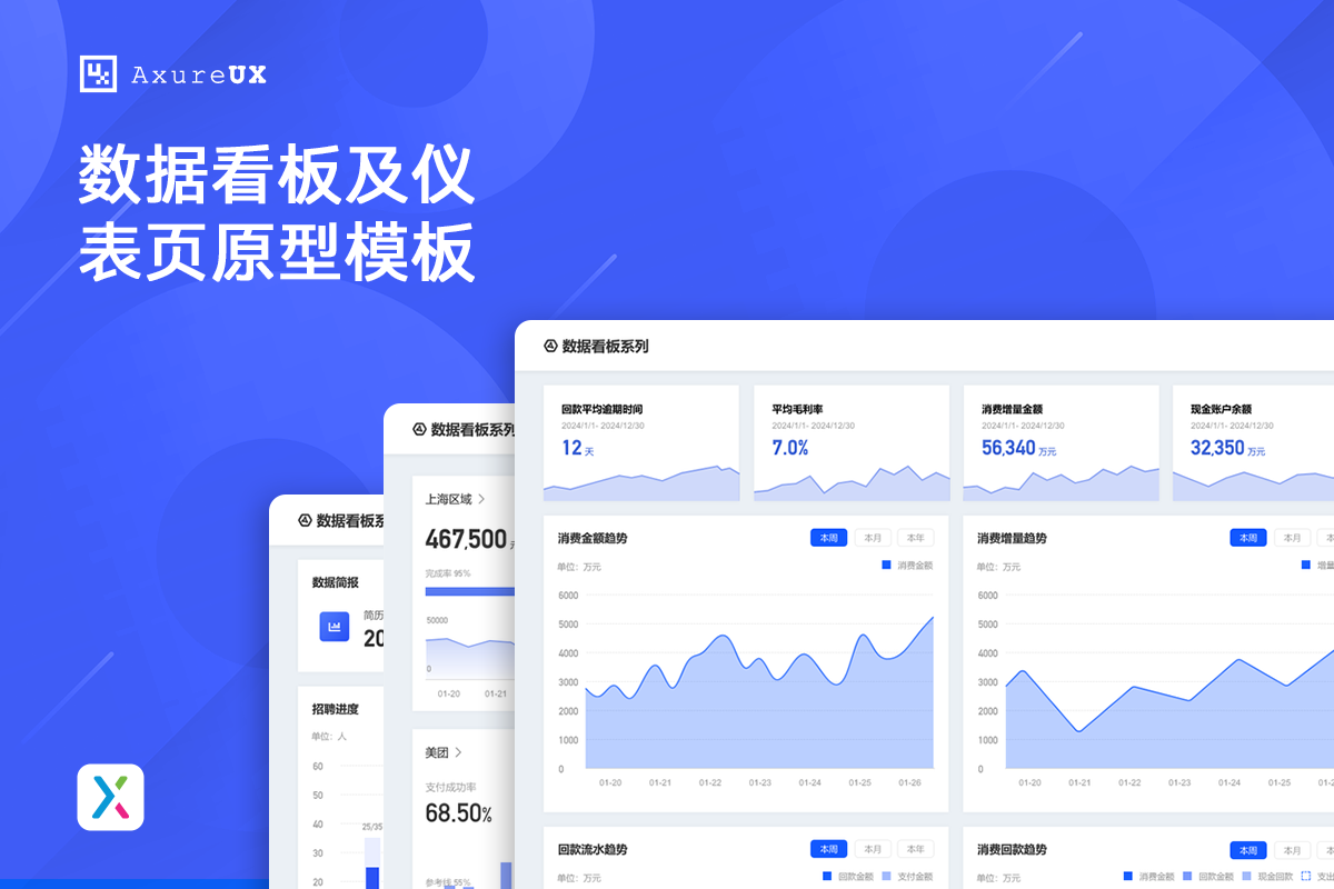 这是一套AxureUX专为数据分析看板而推出的原型作品,包含了各种行业类型和业务场景的数据分析模板。在以前的作品中虽然也包含了数据分析看板相关的内容,但是不够全面和丰富,由于这个主题也是很多用户感兴趣的,于是我们重新进行了梳理并制作了这套专题作品,作品中包含的数据看板类型有智慧医院、数字零售、电子商务、物流货运、客户管理、工单管理、招聘管理、物业管理等。