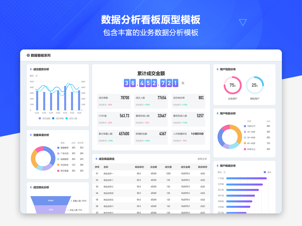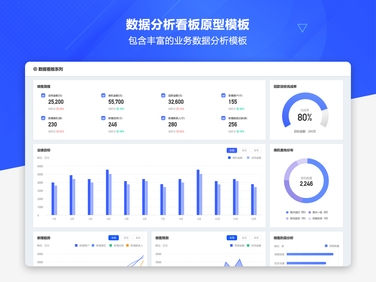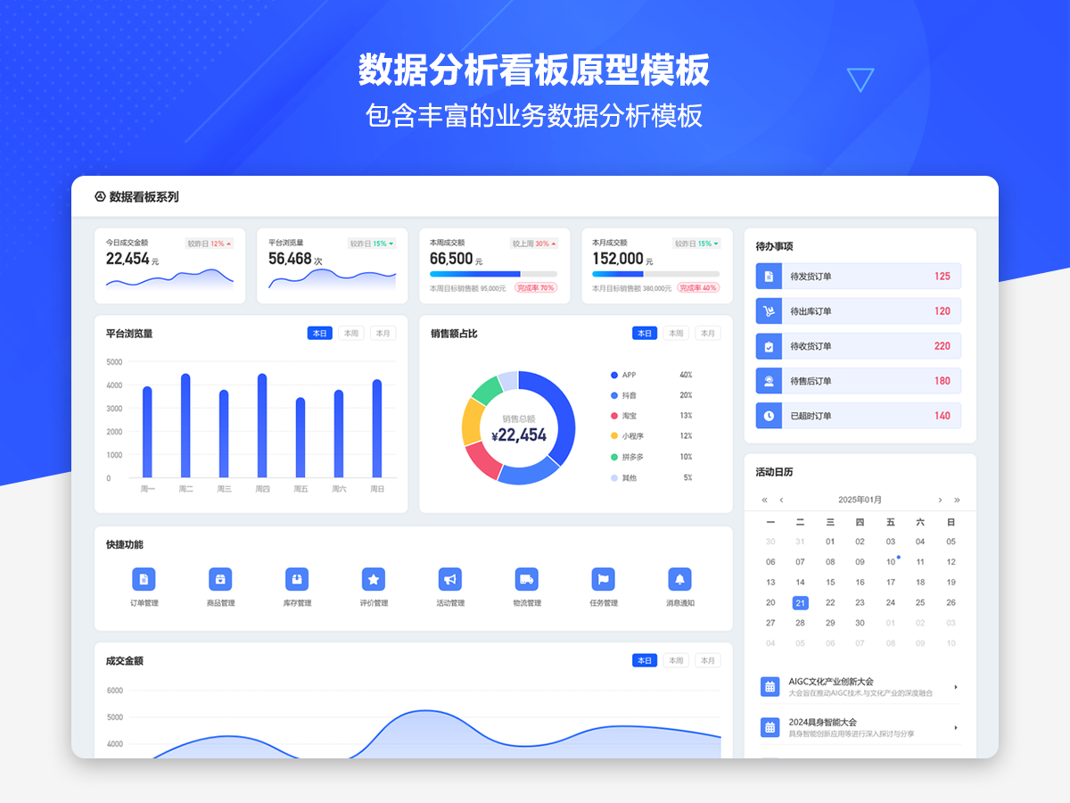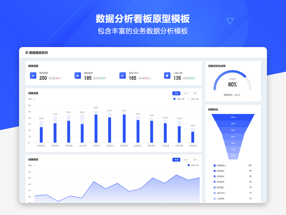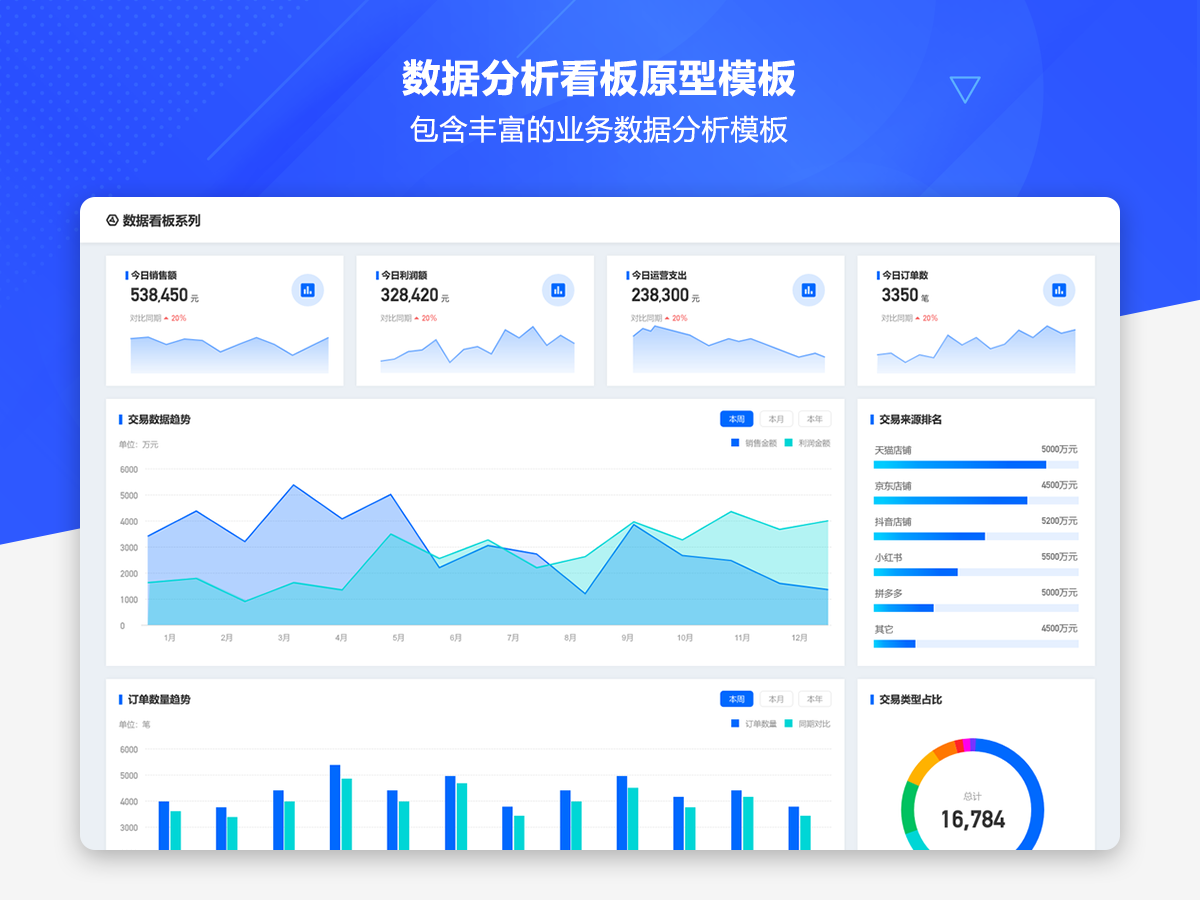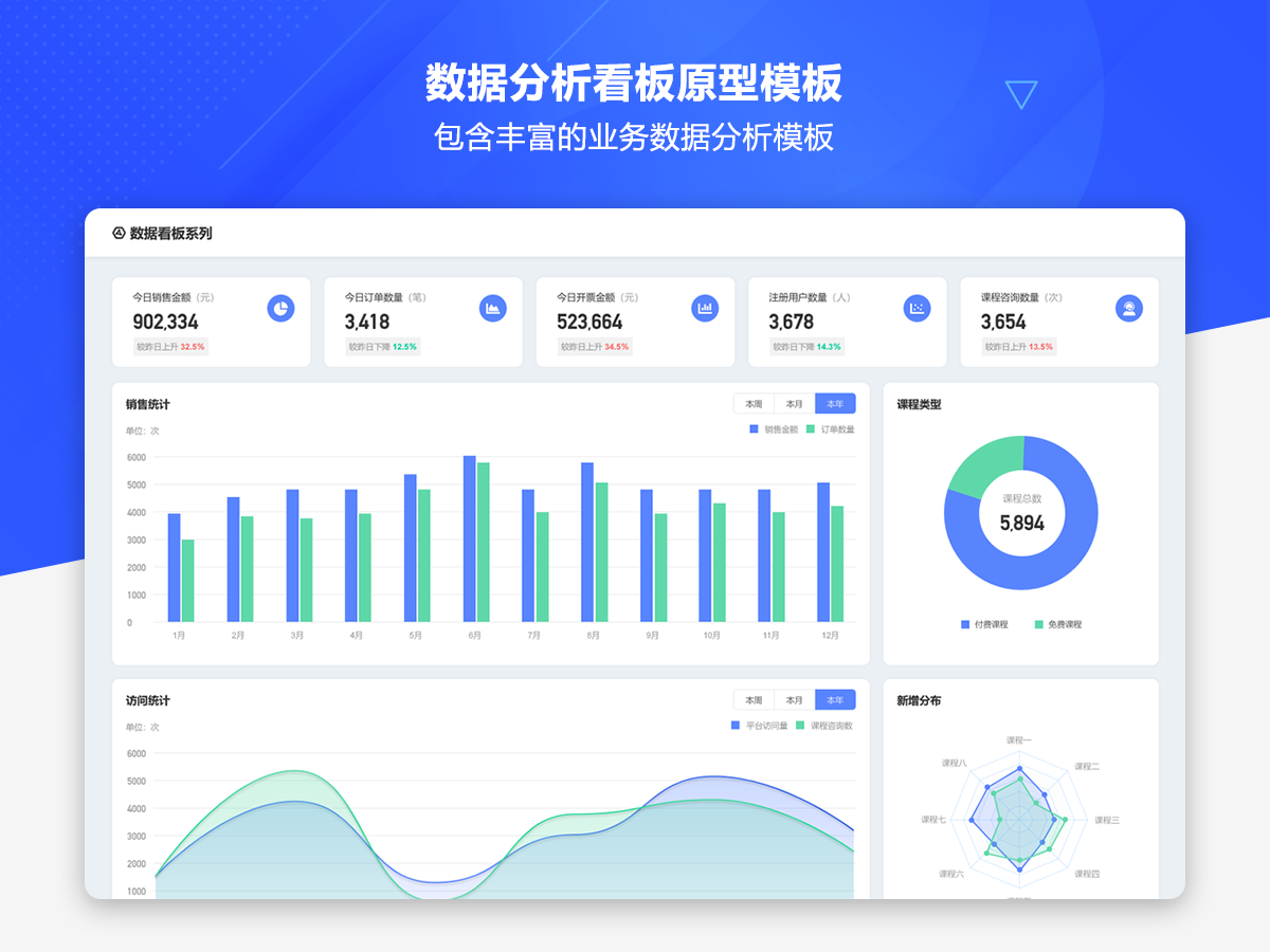 这是一套AxureUX专为数据分析看板而推出的原型作品,包含了各种行业类型和业务场景的数据分析模板。在以前的作品中虽然也包含了数据分析看板相关的内容,但是不够全面和丰富,由于这个主题也是很多用户感兴趣的,于是我们重新进行了梳理并制作了这套专题作品,作品中包含的数据看板类型有智慧医院、数字零售、电子商务、物流货运、客户管理、工单管理、招聘管理、物业管理等。
