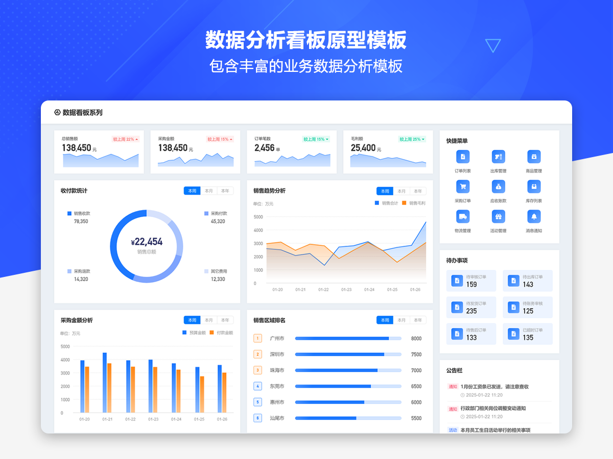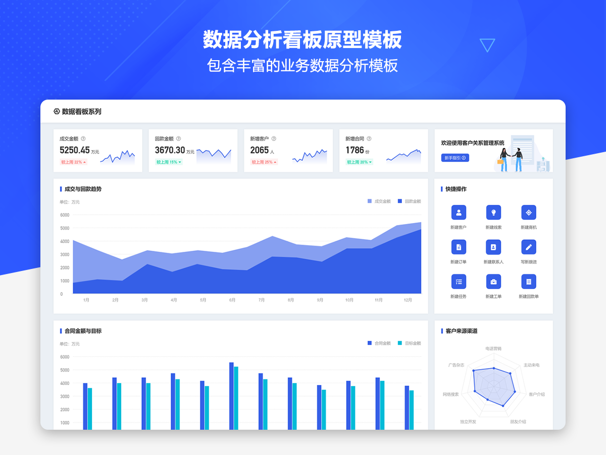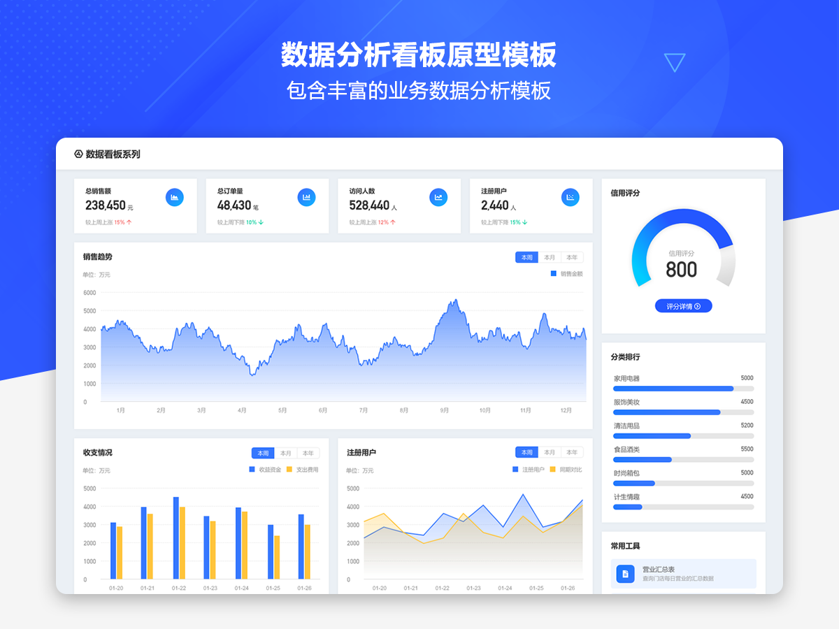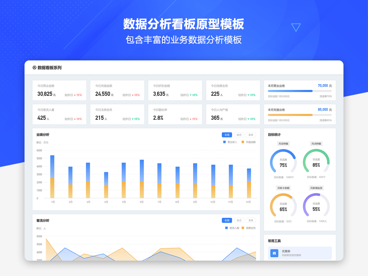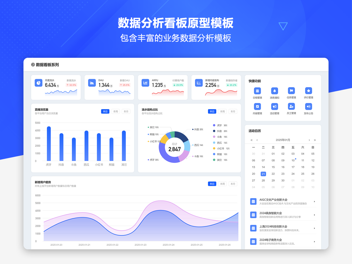 这是一套AxureUX专为数据分析看板而推出的原型作品,包含了各种行业类型和业务场景的数据分析模板。在以前的作品中虽然也包含了数据分析看板相关的内容,但是不够全面和丰富,由于这个主题也是很多用户感兴趣的,于是我们重新进行了梳理并制作了这套专题作品,作品中包含的数据看板类型有智慧医院、数字零售、电子商务、物流货运、客户管理、工单管理、招聘管理、物业管理等。
