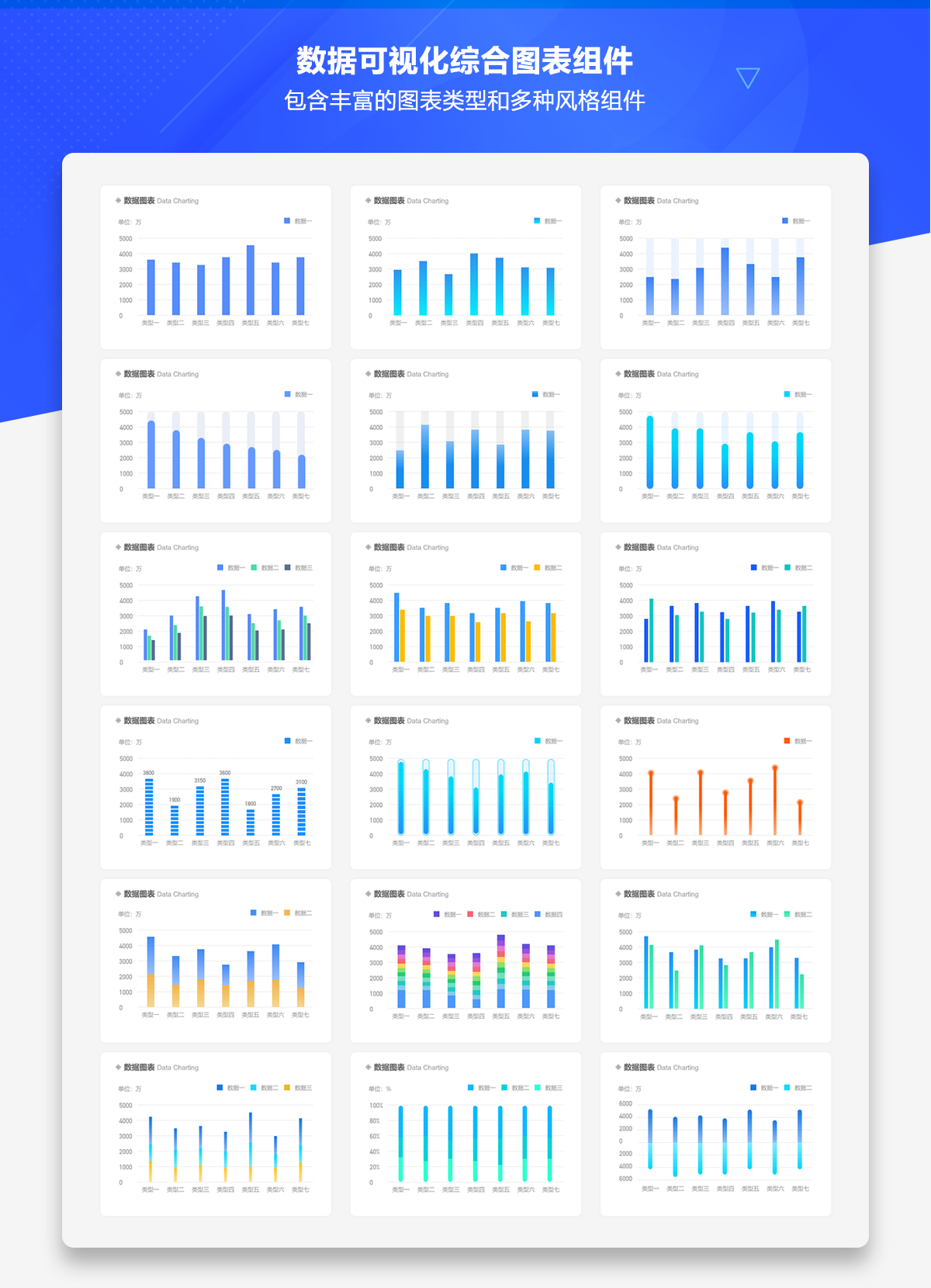 通过这套作品不仅可以获取不同风格的数据分析看板的界面模板和各类常用组件,另外还包含了AxureUX之前发布的数据可视化图表组件库v2版的完整内容,其中共包含面积图、柱状图、折线图、条形图、圆环图、雷达图、仪表图、漏斗图、气泡图、综合类等10种图表类型,其中有500多个各种风格的独立的图表组件,可满足大部分原型设计使用场景。另外,还有数值展示、数据排行、数据表格、数据轮播等相关内容。作品中的图表组件均为静态元素,支持文字、尺寸、色彩等属性修改,可根据具体的设计风格和布局方式进行调整。