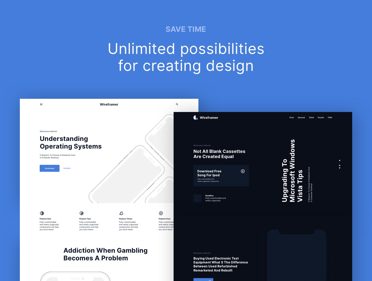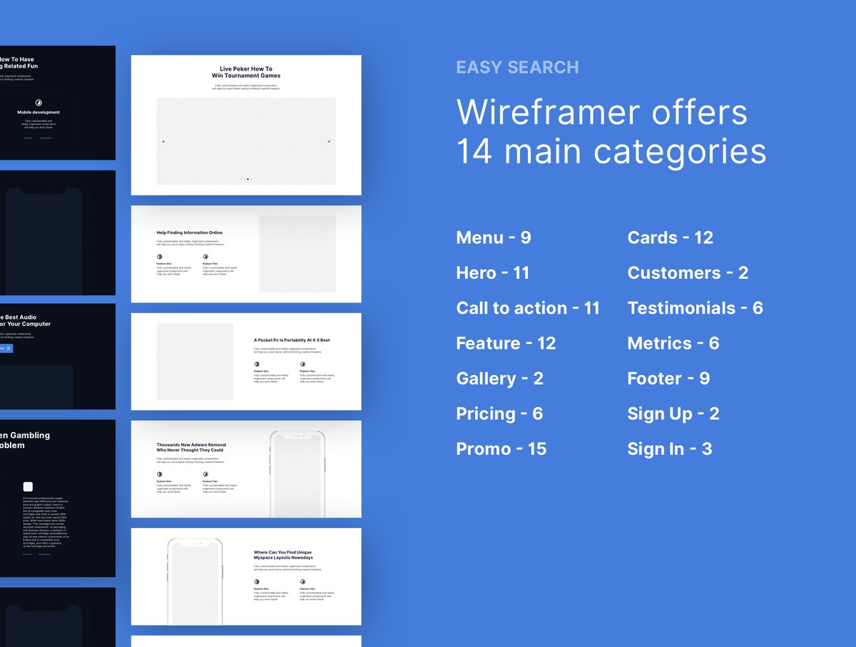 借助 Wireframer,你的设计创作将拥有无限可能!我们的资源库包含:120+ 布局模板、2 种配色主题、300+ 基础元素,且按 14 大核心类别规整分类。全自定义组件设计,助你大幅提升工作效率。
