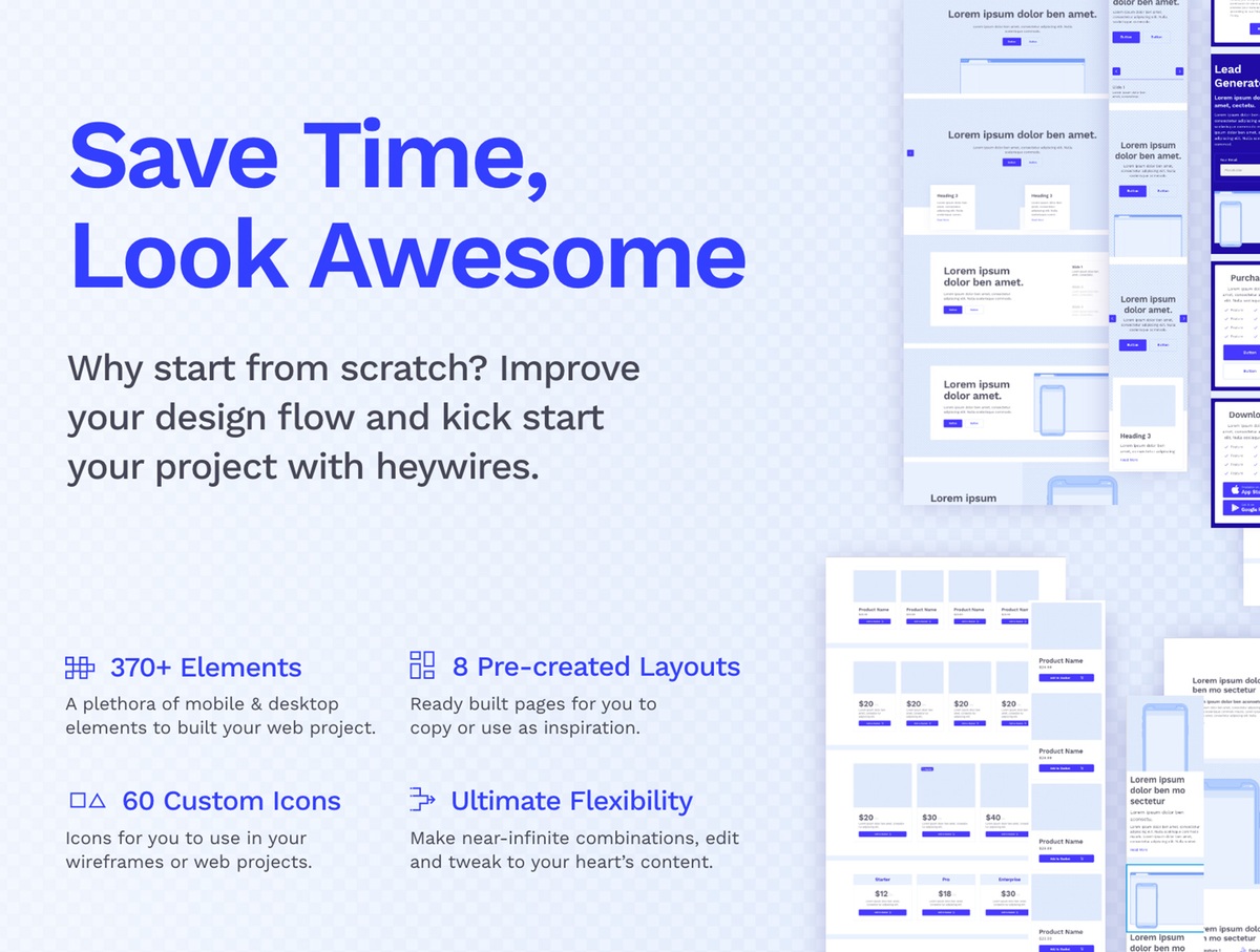 Heywires线框素材合集,一套Adobe XD专属的可扩展高保真线框库,同时适配移动端与桌面端设计,打造惊艳眼球的高保真线框,无缝衔接高品质设计落地。借助 Heywires精心打磨的布局模板、功能组件与图标素材,以扎实基础快速启动项目,大幅节省设计时间。用Heywires优化你的设计流程、助力项目快速启动 —— 省时省力、灵感迸发,让线框设计成为一件值得称道的乐事!