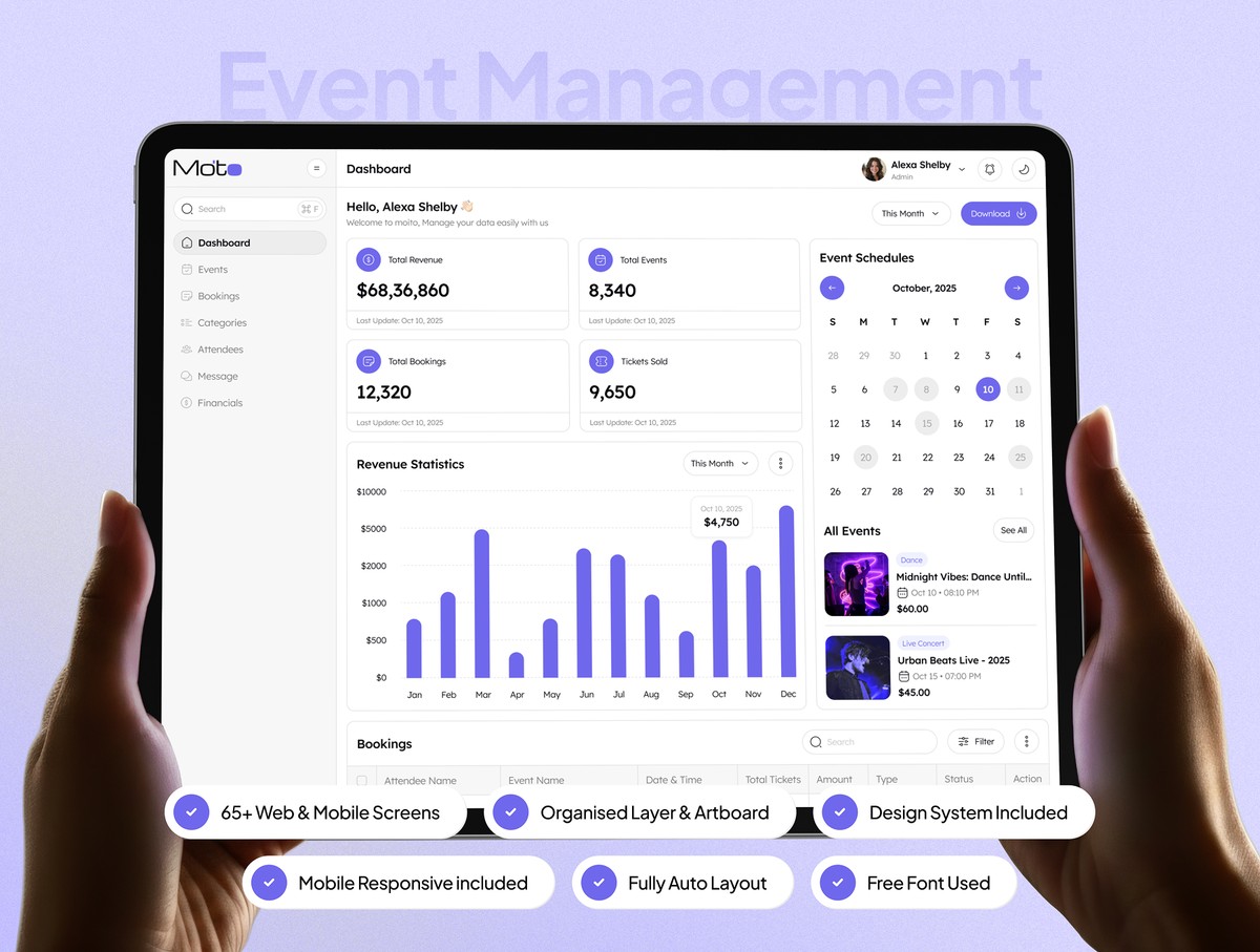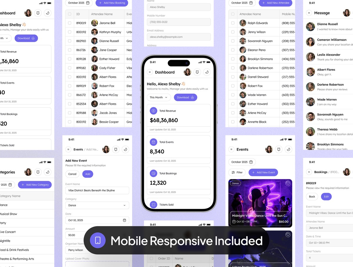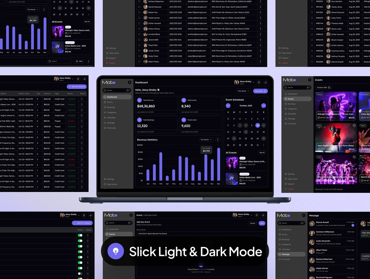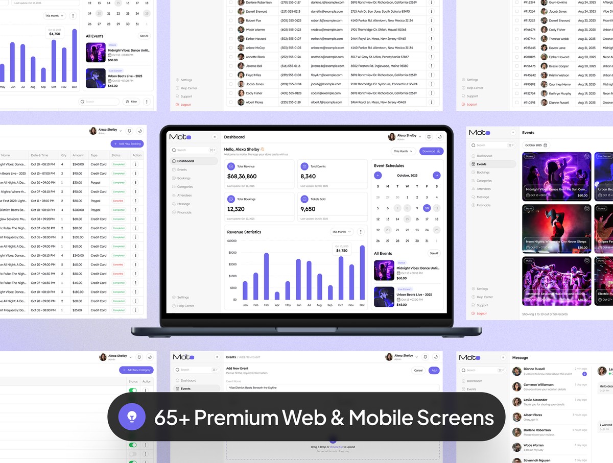这是一套匠心打造的精品合集,内含 65 + 款网页端与移动端界面,专为管理人员打造,助力简化活动管理流程、全方位提升后台操作体验。套件搭载人性化操作界面,功能丰富完备,为线上活动管理工作打造一站式高效平台,实现各类数据的精细化、高效化管控。依托这套简洁大气、兼具现代美感与视觉表现力的设计,搭配质感出众的亮色/暗色双界面模式,你能够轻松搭建出高颜值的管理后台。无论你是经验丰富的资深开发者,还是刚入门的新手,本 UI 套件都能帮你落地所有设计构想。