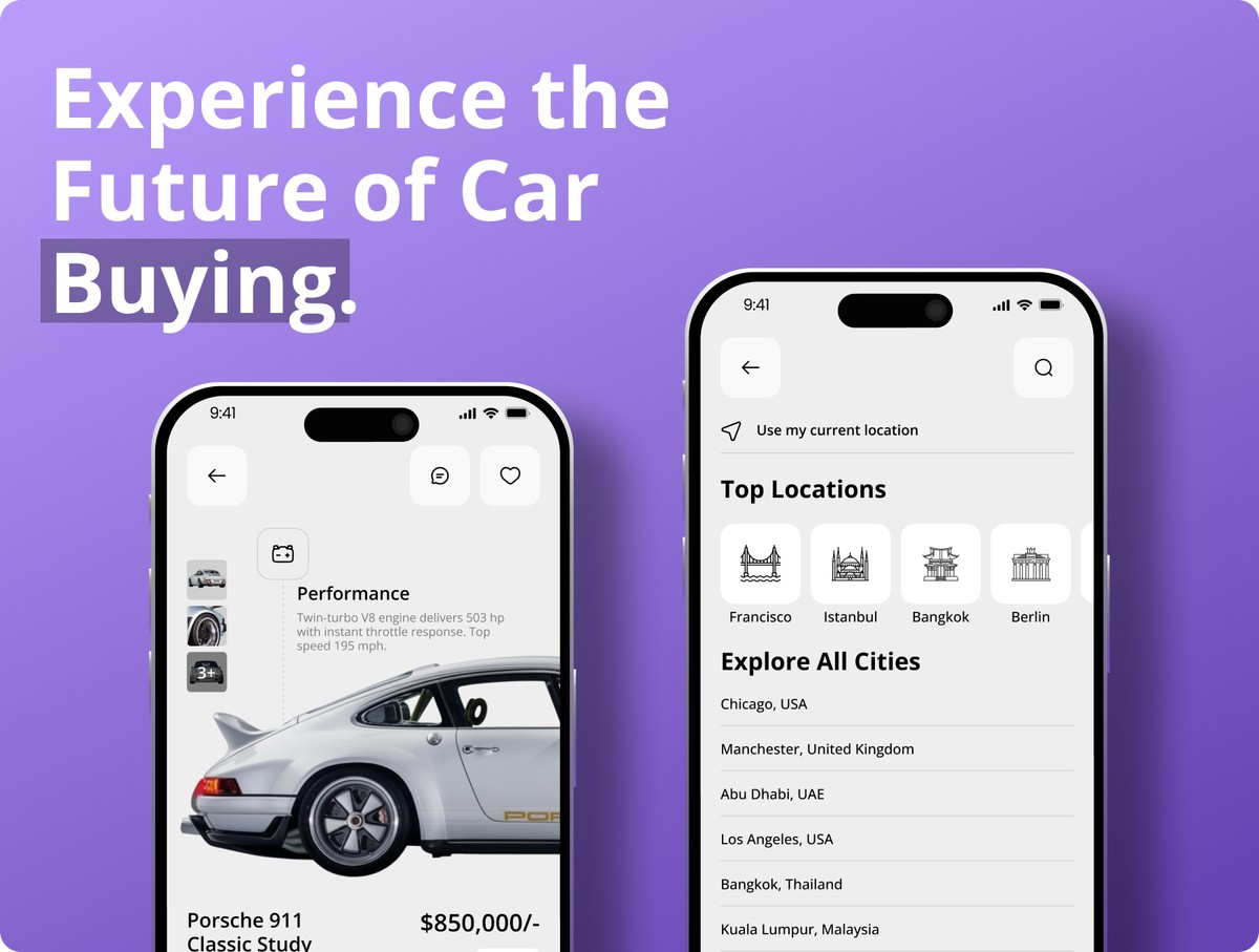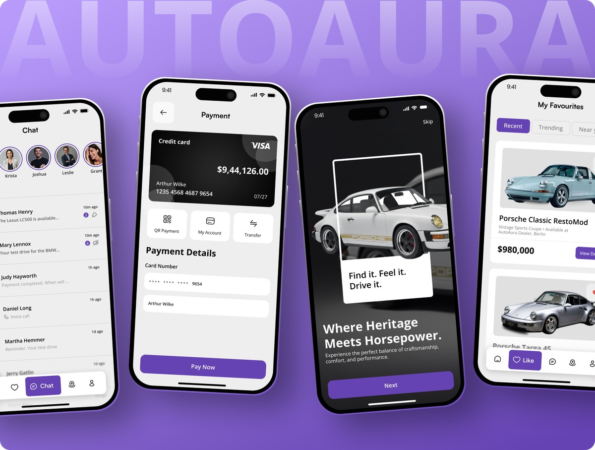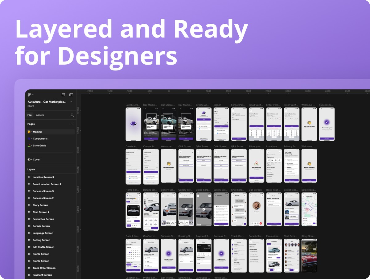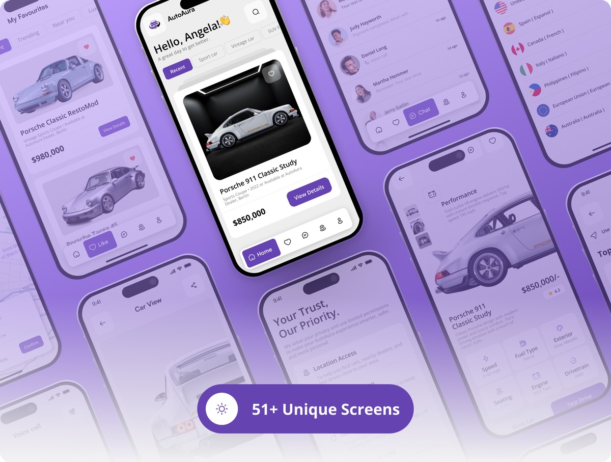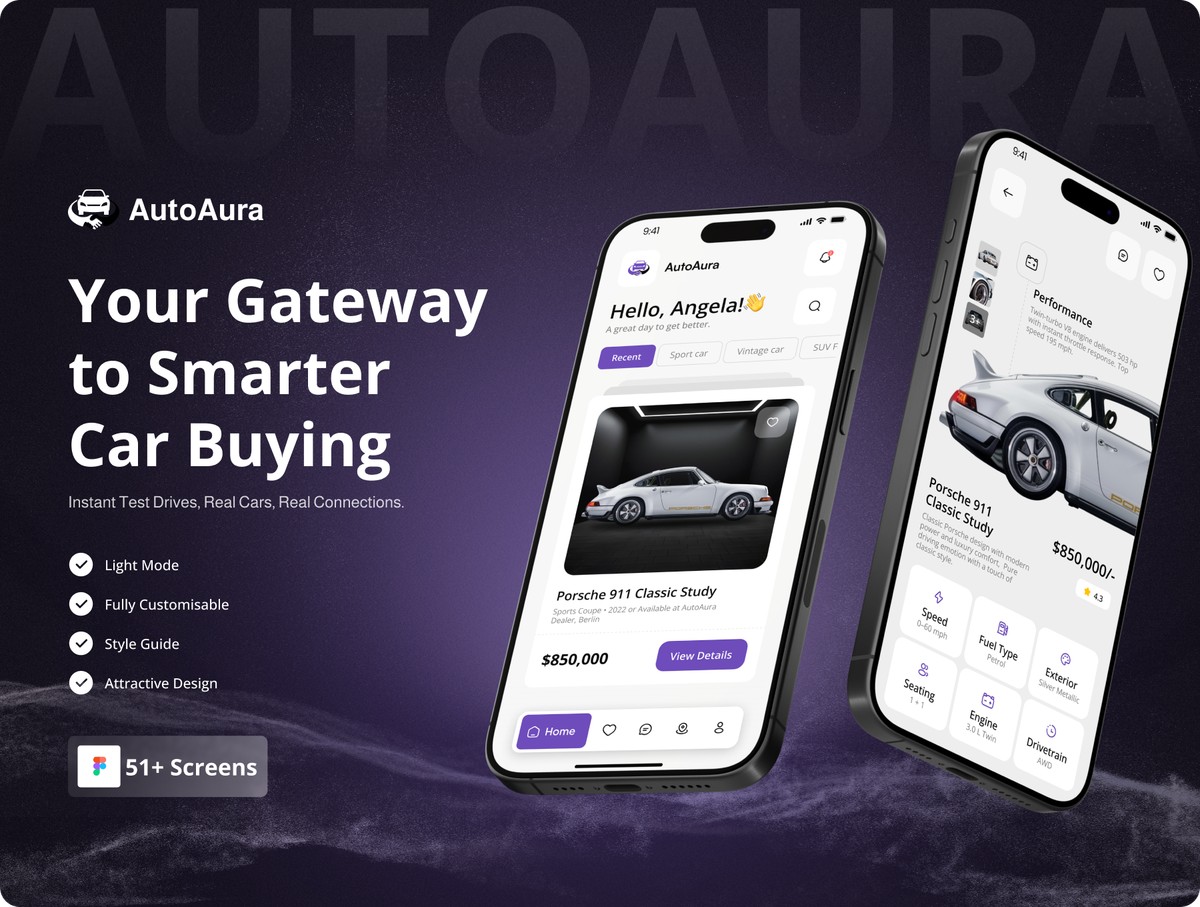 借助 AutoAura 打造购车领域全新体验 —— 这是一套设计现代、界面简洁、功能完备的汽车交易平台应用 UI 套件,可实现流畅的车辆浏览、试驾预约、交易支付,以及买卖双方的实时沟通全流程。本套件基于 Figma 工具打造,为你提供一套完整的设计体系,内含 50 + 款精雕细琢的移动端页面,覆盖引导页、车辆列表、筛选、对比、车型详情、在线聊天、支付、定位、偏好设置及个人资料管理等全场景。
