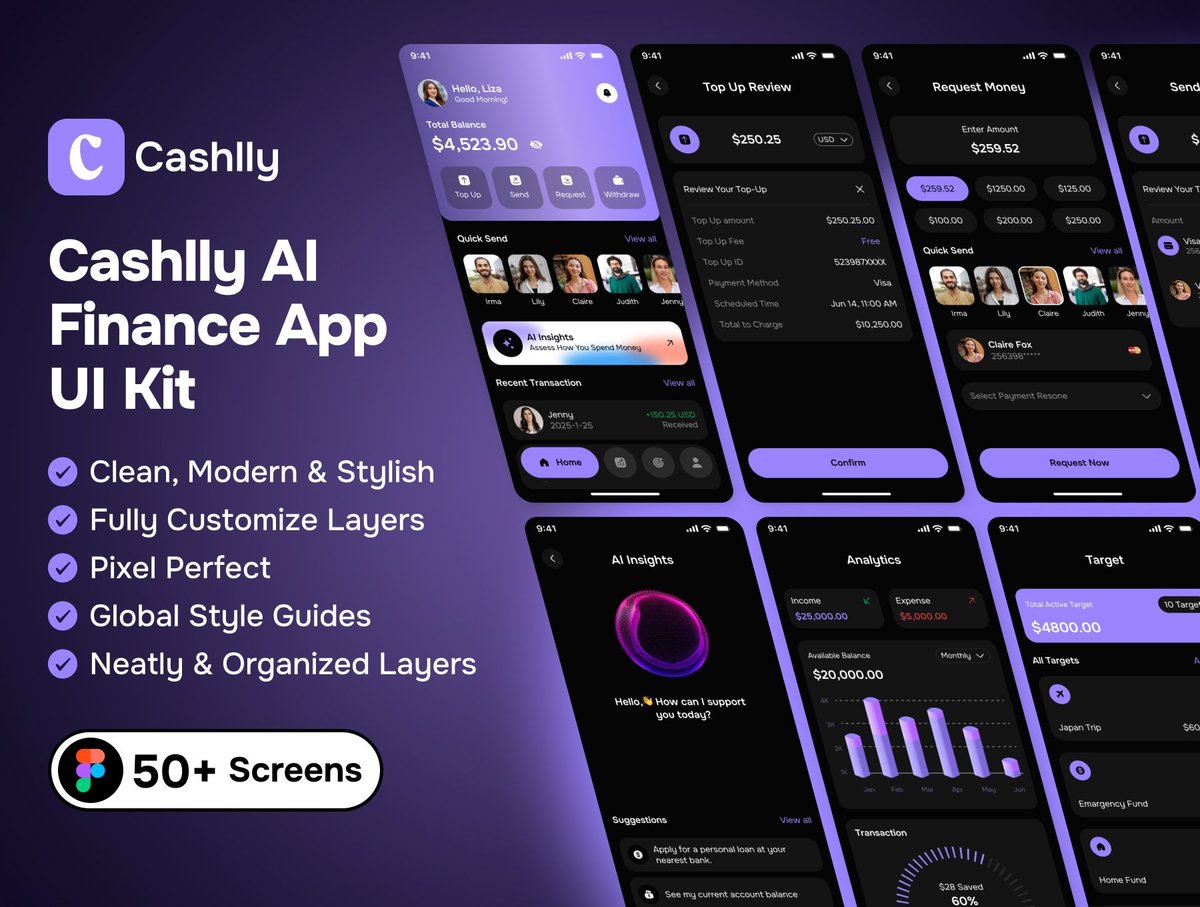 Cashlly 是一套简约精致、搭载智能 AI 能力的金融应用界面组件库,专为重塑用户的资金记账、储蓄与管理方式打造。该现代化移动端界面组件库基于 Figma 设计,将金融科技的专业严谨,与人工智能赋能的简洁易用完美融合,助力创业团队与设计师打造真正智能化的金融服务体验。