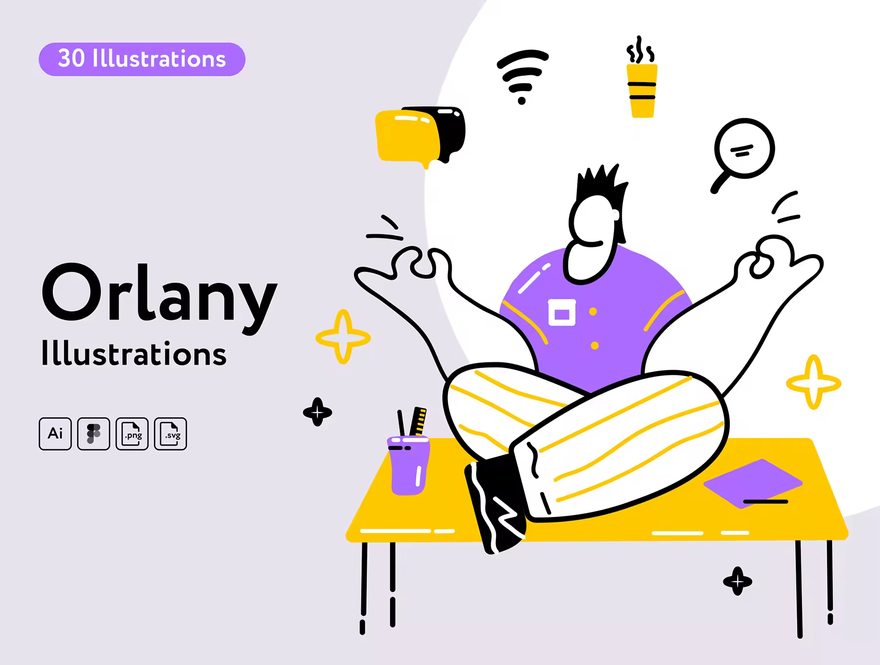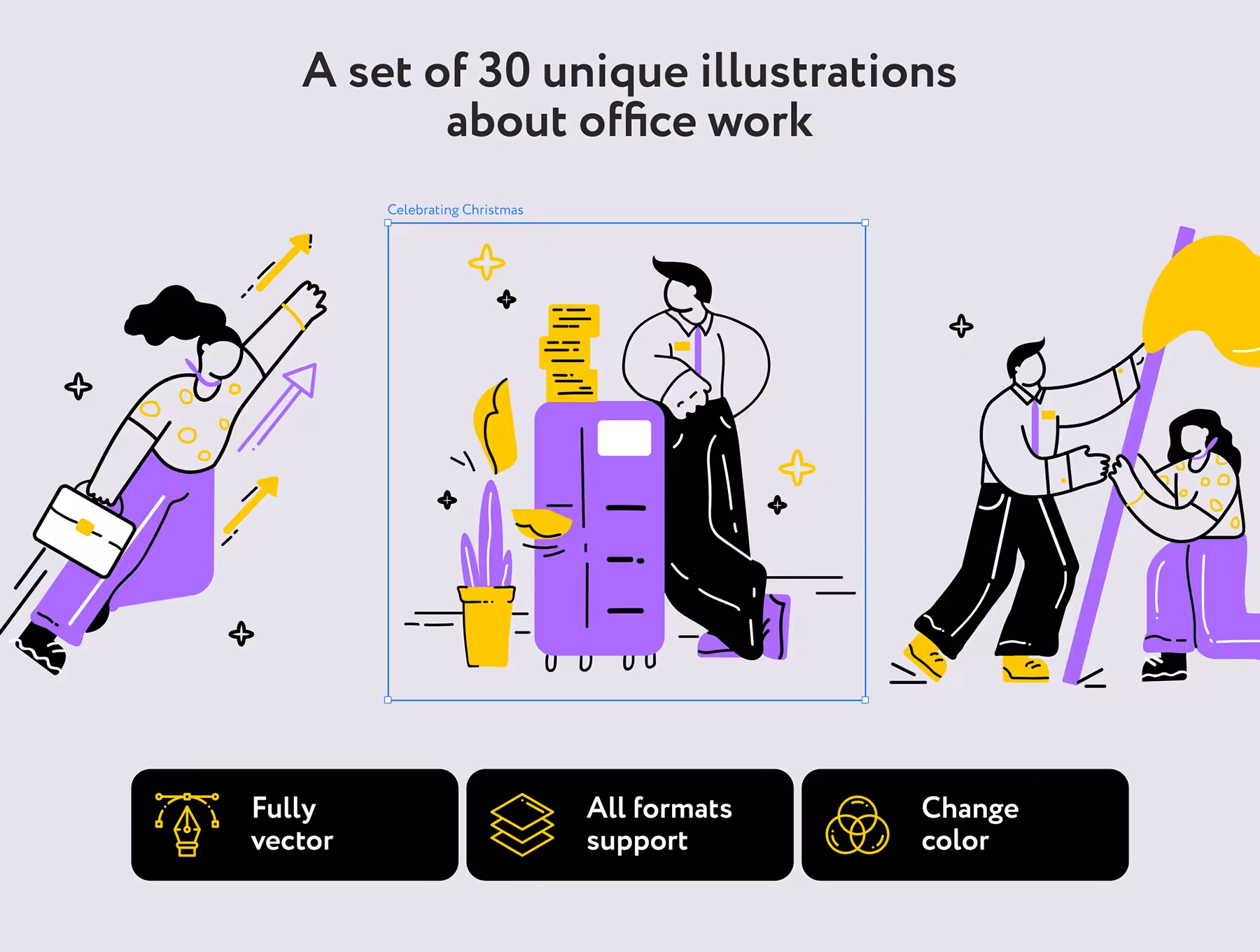 一套30个关于办公室工作、团队合作的插画。用于装饰无聊的网站页面、移动应用程序屏幕或印刷产品的绝佳收藏。简单易用的颜色更改将帮助您快速调整插图以适应您的创意任务和想法。