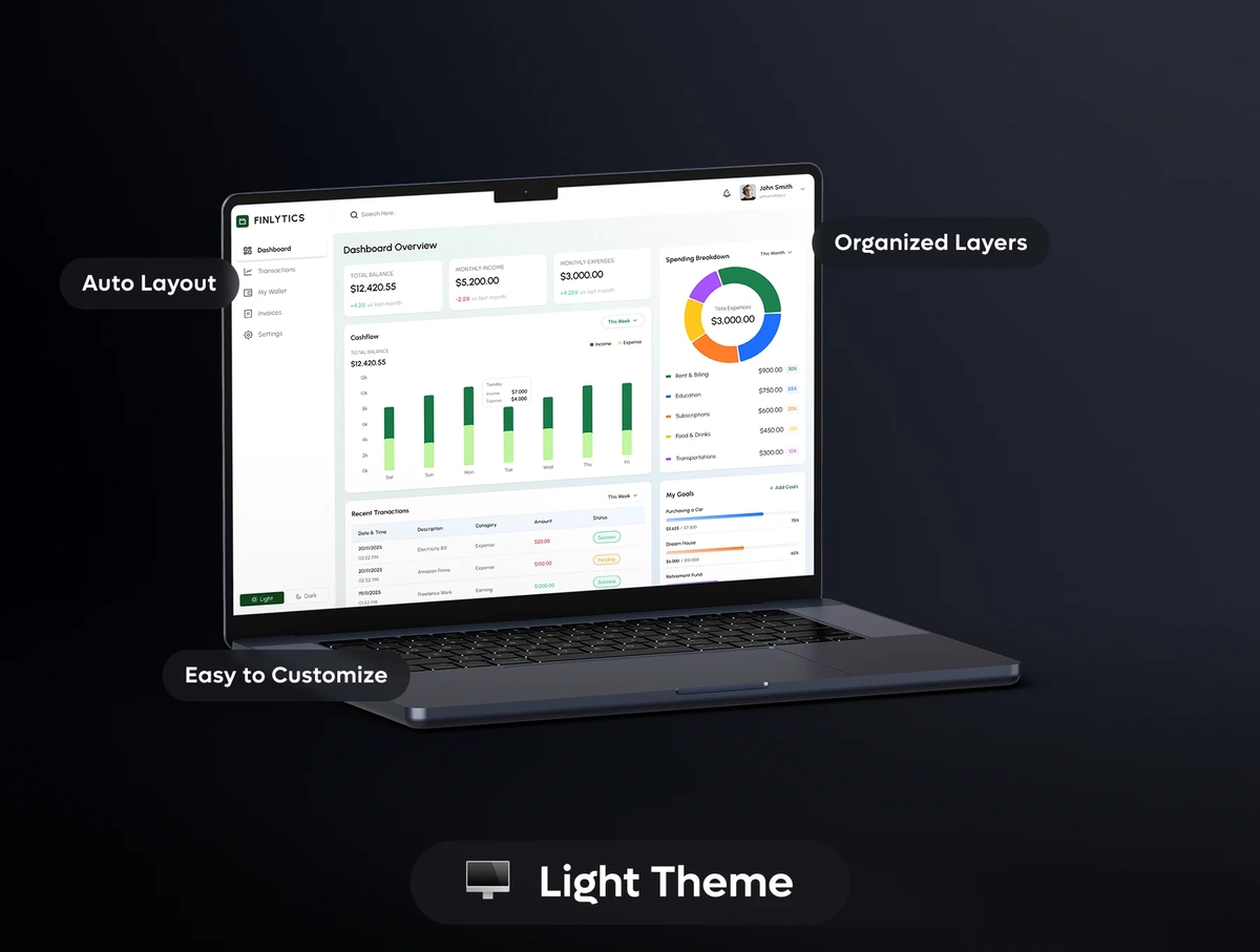 基于 Figma 打造的现代化财务管理数据看板界面组件库,包含Web与APP两种界面类型。版式简洁规整,搭载可复用组件,同时适配亮色、深色双模式。
