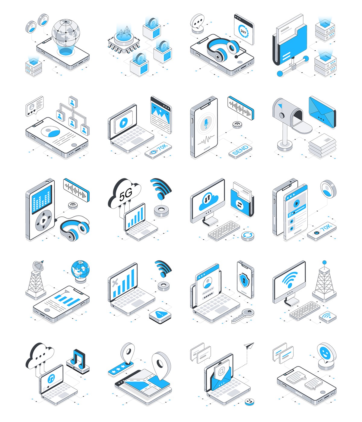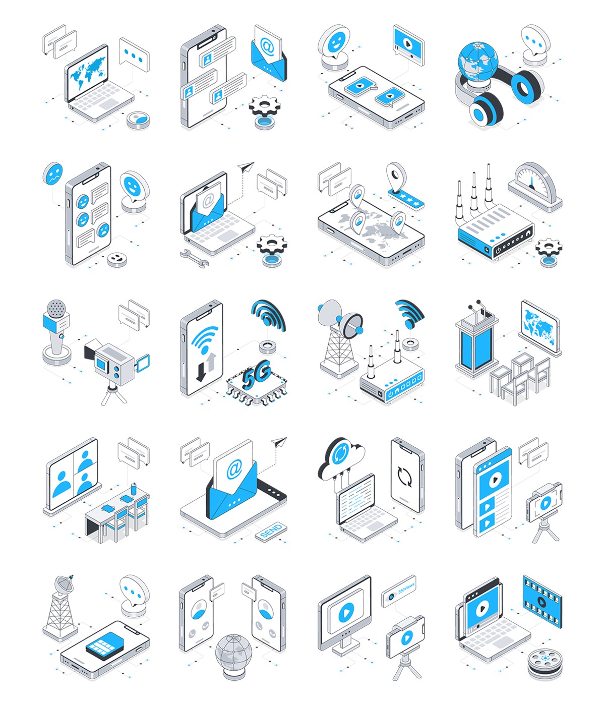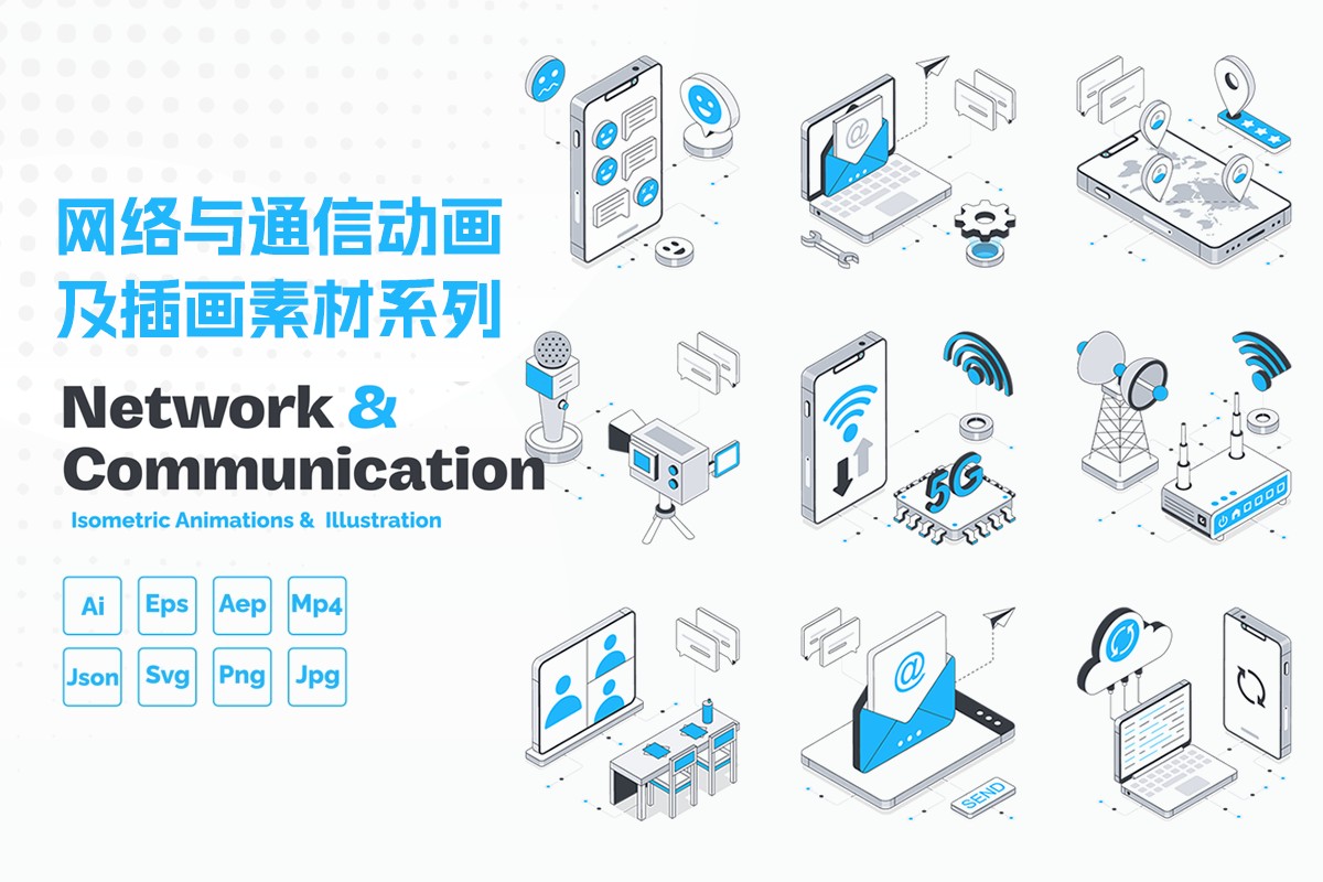 为网站、应用程序或演示文稿创建独特的网络与通信动画及插画。本素材包能切实满足你的数字化设计需求,你可将这些动画与插画用于网站,尤其适合头部(Header)区域。所有素材均可轻松调整尺寸,并根据需要修改每个图形的颜色;你还可以组合不同元素,创作属于你自己的网络与通信主题作品。