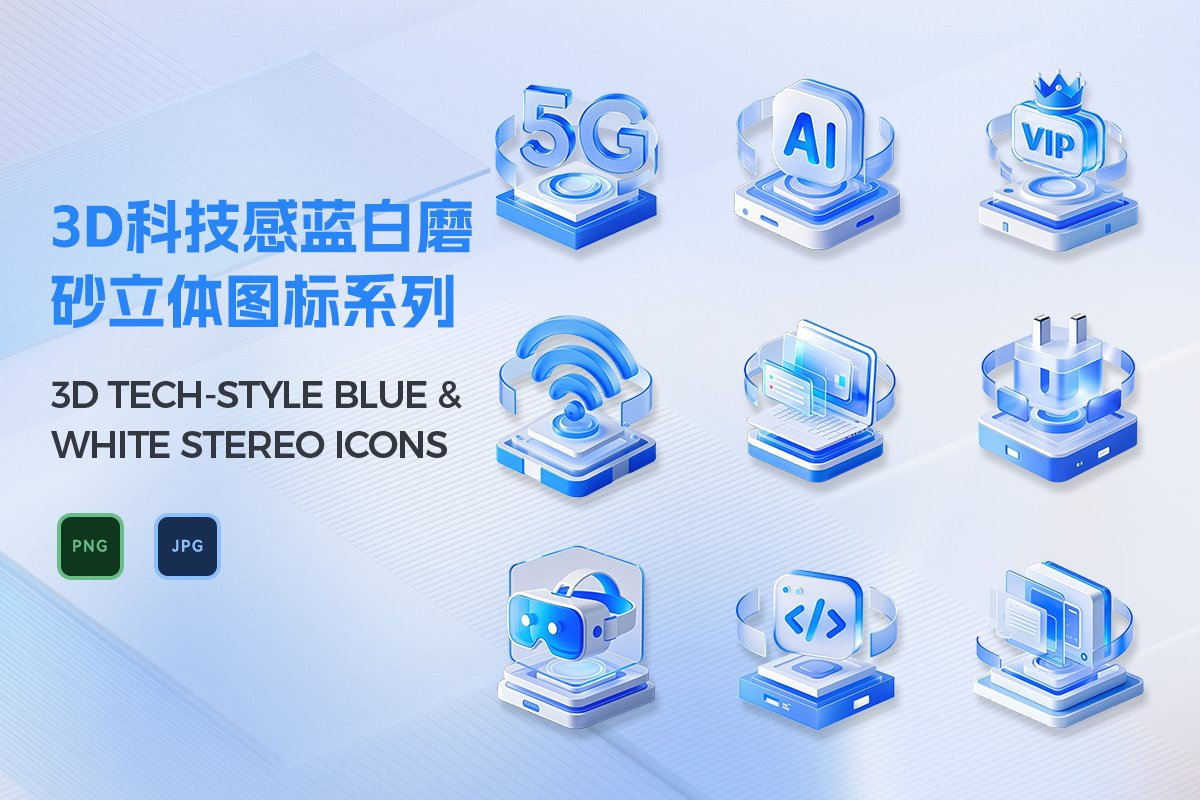精选40枚质感拉满的3D立体图标,以科技蓝白为主调,融合当下流行的磨砂玻璃美学,为你的数字作品注入高级感与未来感。涵盖电子设备、网络通信、数据存储、人工智能等高频科技类目,适配APP界面、网页设计、演示文稿等多元场景。同时提供JPG与透明底PNG文件,无需二次处理,直接拖拽即可使用,极大提升设计效率。磨砂肌理搭配柔和光影,边缘过渡自然,在浅色与深色背景下均能呈现绝佳视觉效果,兼顾美观与实用性。