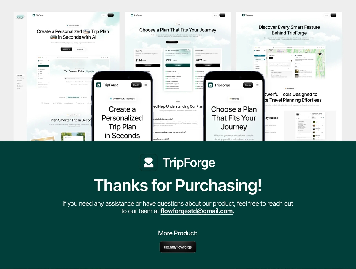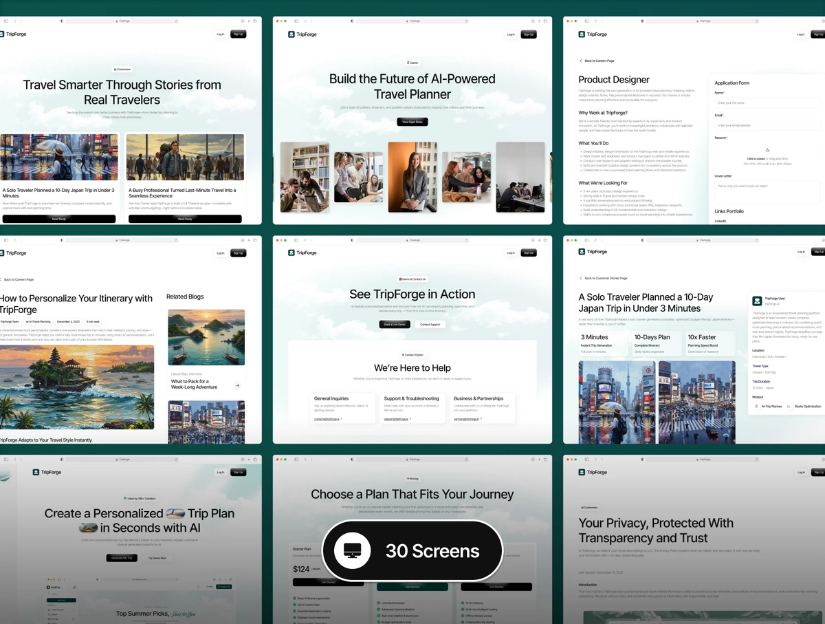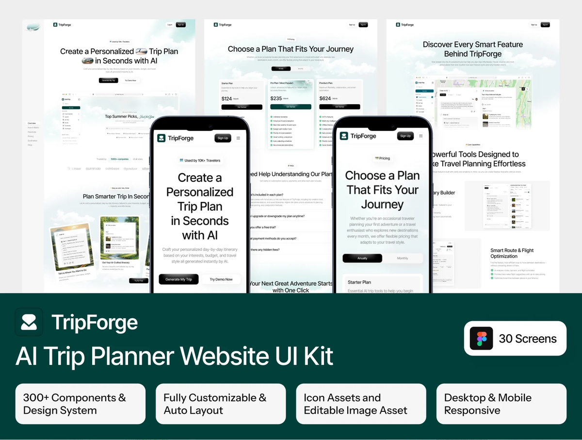 TripForge 是一款 AI 旅行规划类网站 UI 套件,拥有细节丰富、高质量的界面,可在 Figma 中轻松自定义并支持扩展。本套件采用响应式布局设计,助你打造现代化旅行与旅游类网站,非常适合 AI 旅行规划、行程生成、目的地探索、预订指南及个性化旅行体验类项目。它是初创团队、SaaS 产品及开发智能旅行平台或 AI 旅游解决方案团队的理想选择。