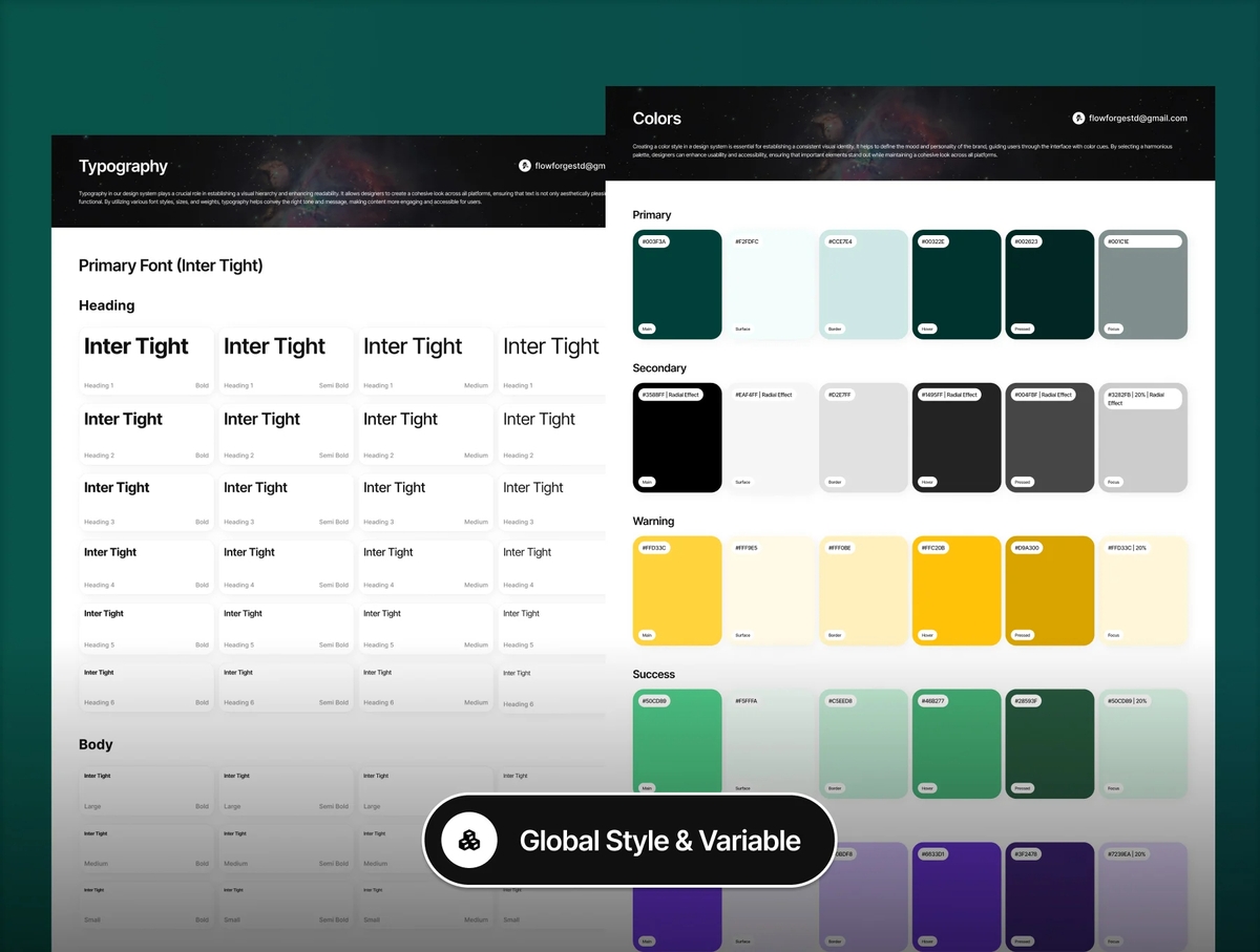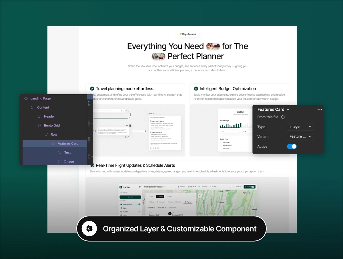 本 UI 套件充分利用 Figma 核心功能,包括设计系统、字体、图标、动态组件、变量及变体组件。所有元素均为矢量格式、结构清晰、易于编辑,让你在产品发展过程中轻松调整与扩展设计。
