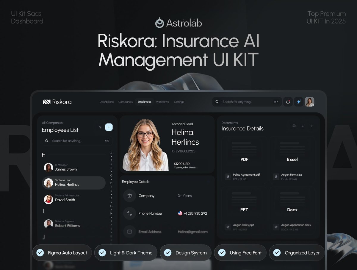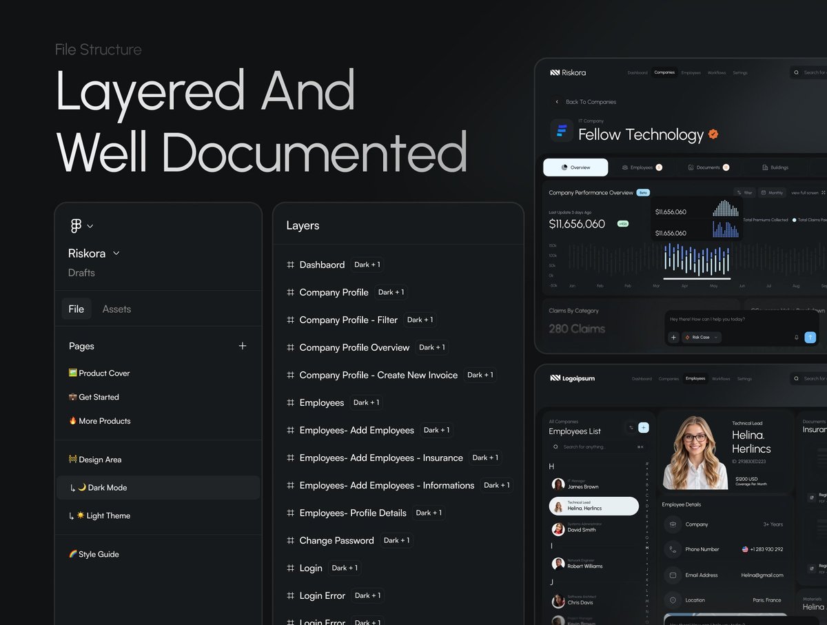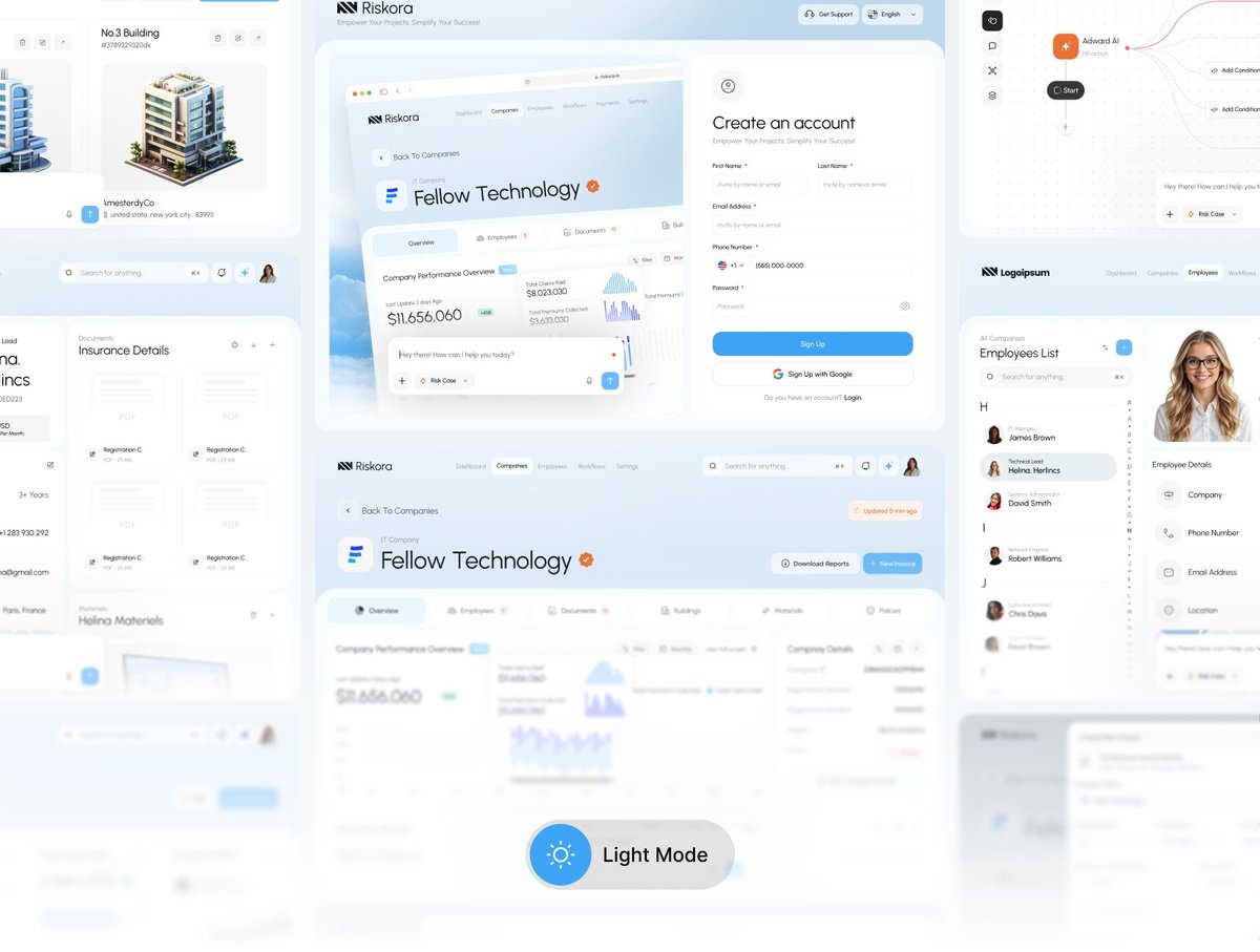 Riskora 是一款可扩展的 Figma UI 套件,面向搭建商业保险产品的团队设计 —— 覆盖从报价到出单、保单续保、核保工作台、经纪人门户以及 AI 辅助理赔等全流程。这套简洁、极简的套件提供完整流程设计,包括登录认证、核保与定价、保单管理、首次报案 / 理赔分流、经纪人提交和投资组合分析;还内置 AI 助手(类 ChatGPT 风格),用于信息摘要、风险评分与智能操作。套件基于原子化设计、自动布局、组件变体和响应式画板构建,让你设计更快、上线更高效。