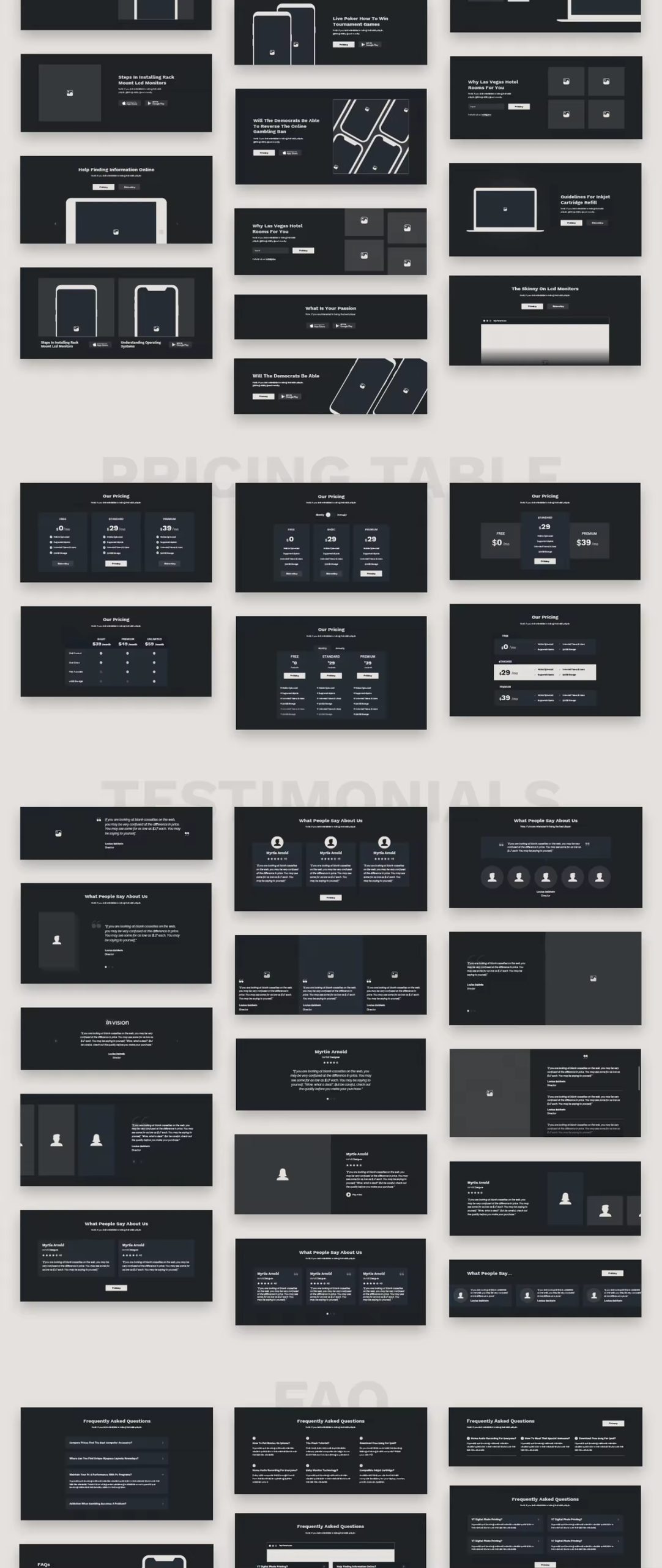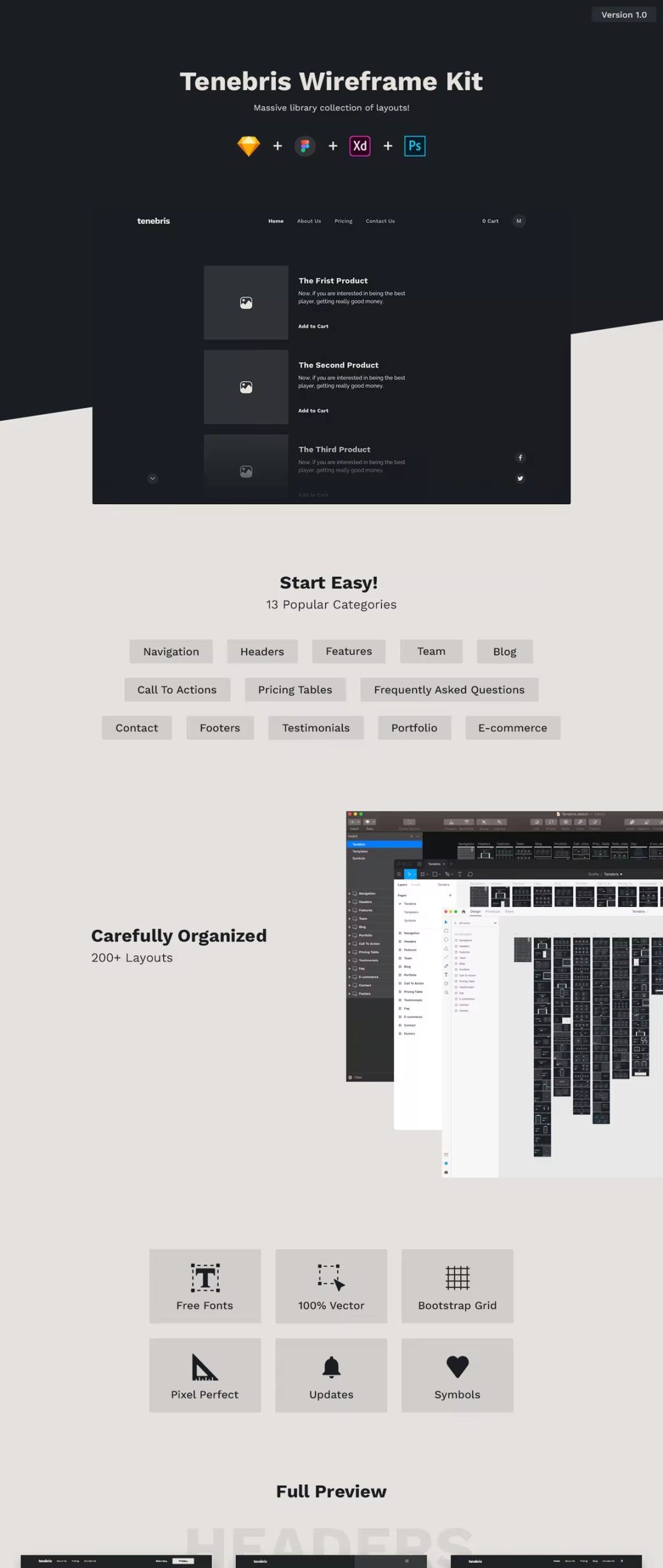 使用这款线框套件加快创建原型的速度。它是13个热门类别中200多种布局的庞大集合。所有元素都是基于100%矢量的,完全可编辑,并使用引导网格创建,并可以与Sketch 59 +,Figma,Photoshop CC +和Xd一起使用。